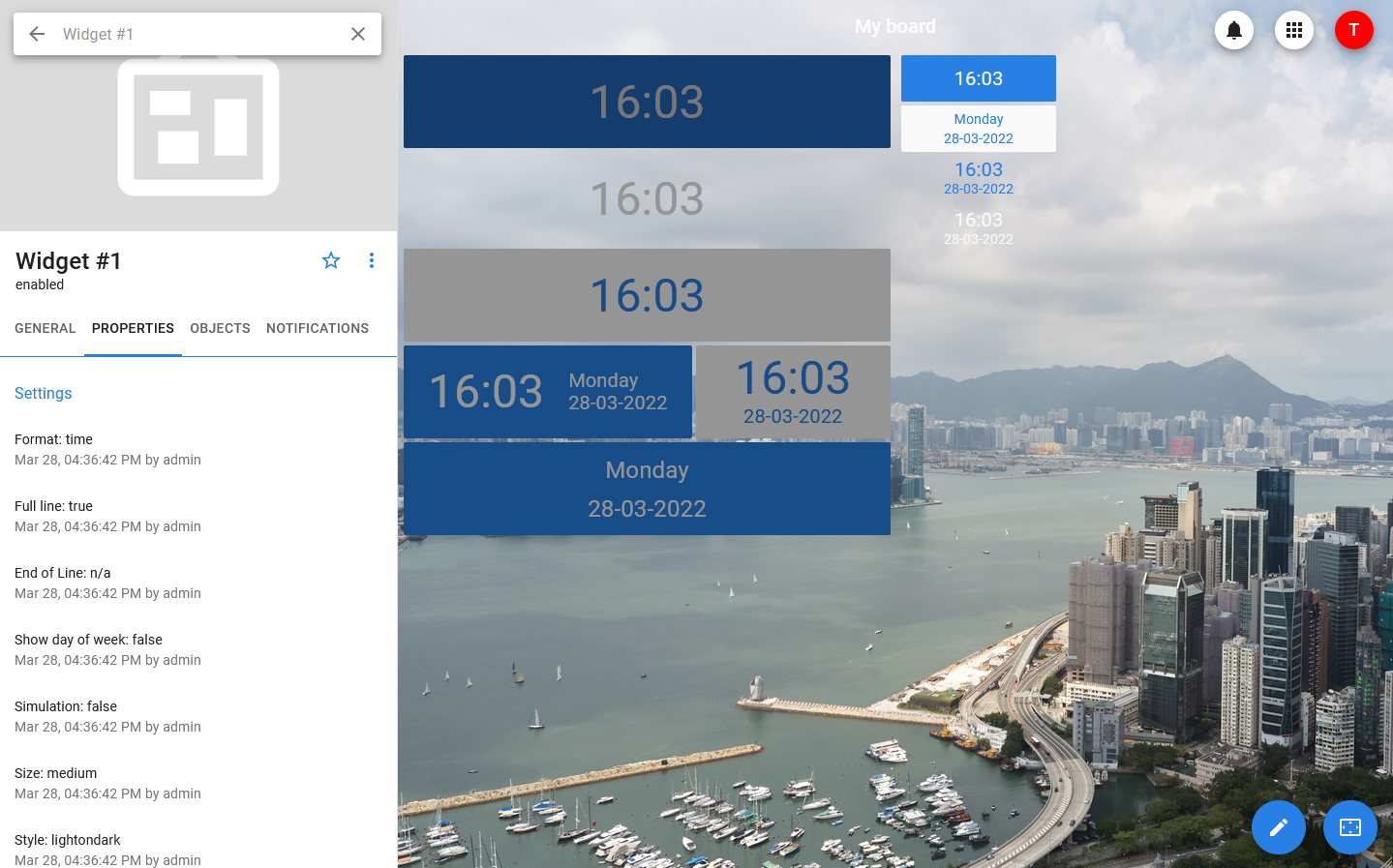 For this widget, you can configure the theme and size, as well as the format for displaying the date and time: it can display only the date, only the time, date and time with or without the day of the week.