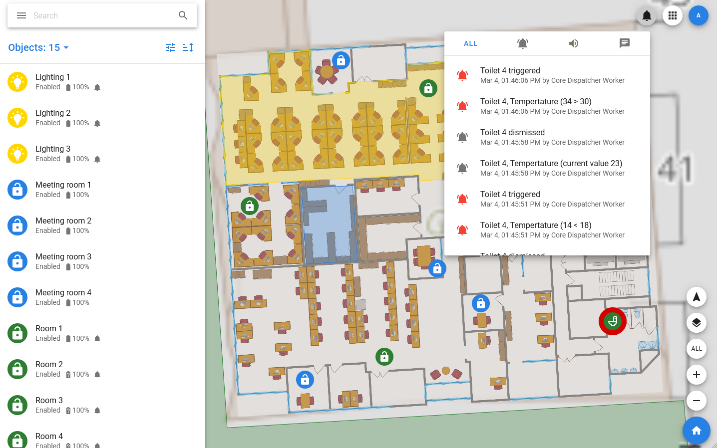 You can view the latest notifications by clicking on the bell in the upper right corner. In the list that opens, you can view all notifications or select a tab with notifications of a specific type, for example, only alarms.